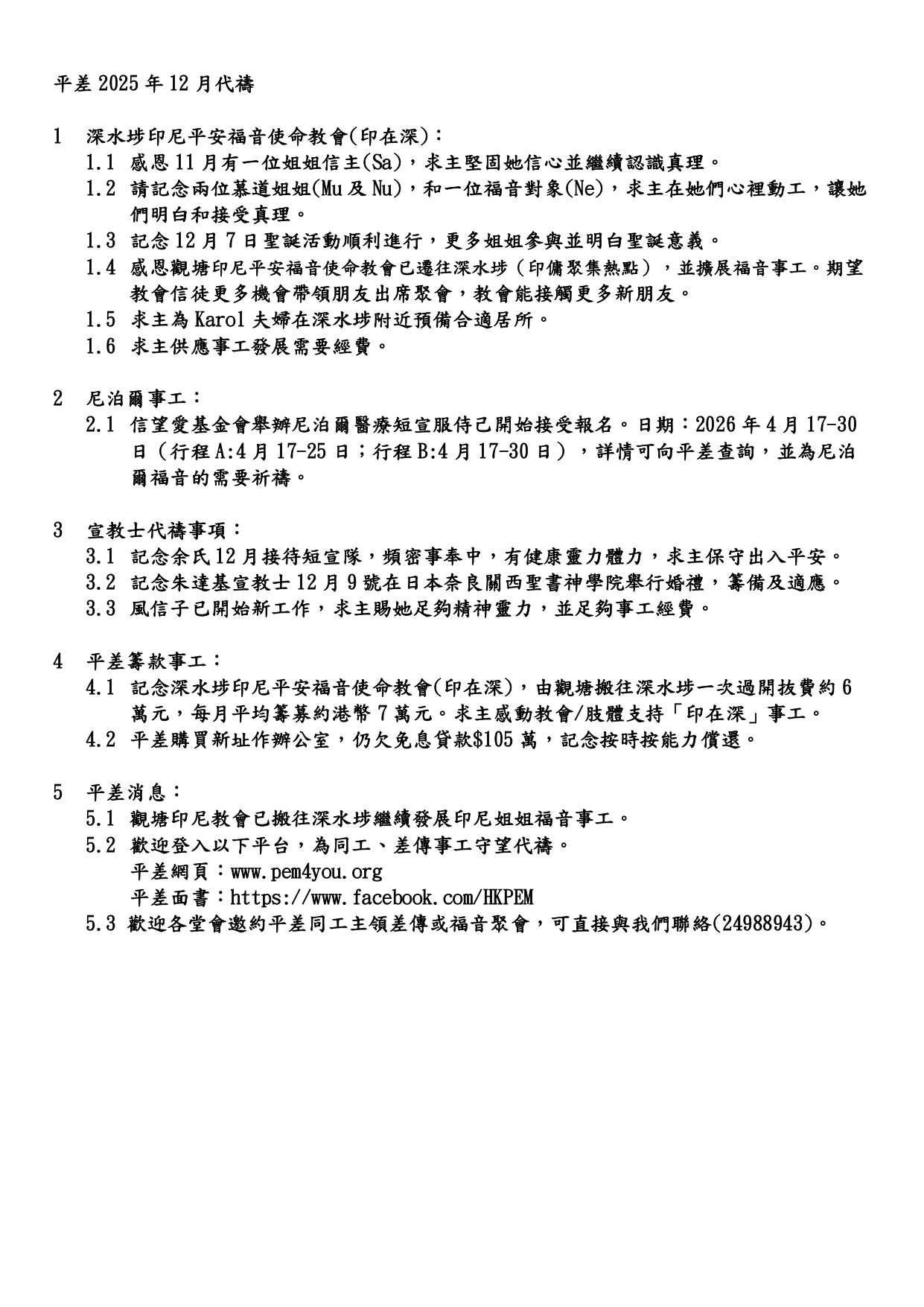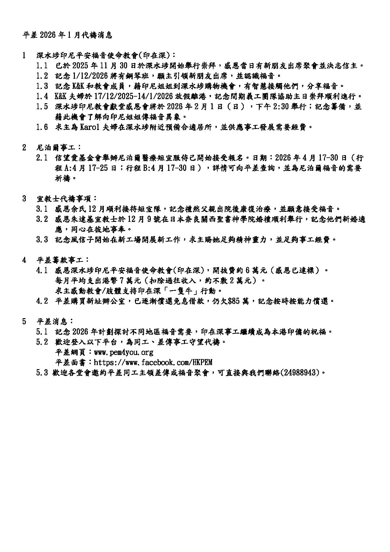 平差2026年1月代禱消息