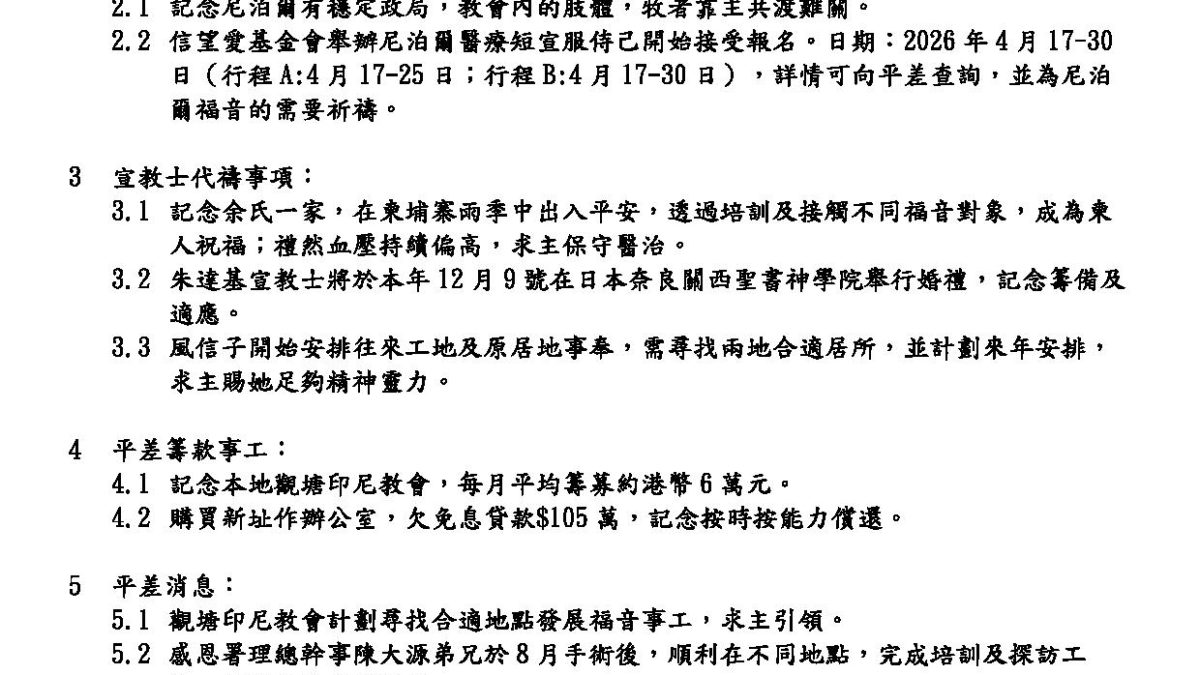 17 10 月, 2025 Related posts5 10 月, 2025附2025_6-9余柬代禱信, 多謝大家代禱記念.Read more30 9 月, 2025平差2025年10月Read more19 8 月, 2025平差2025年9月Read more