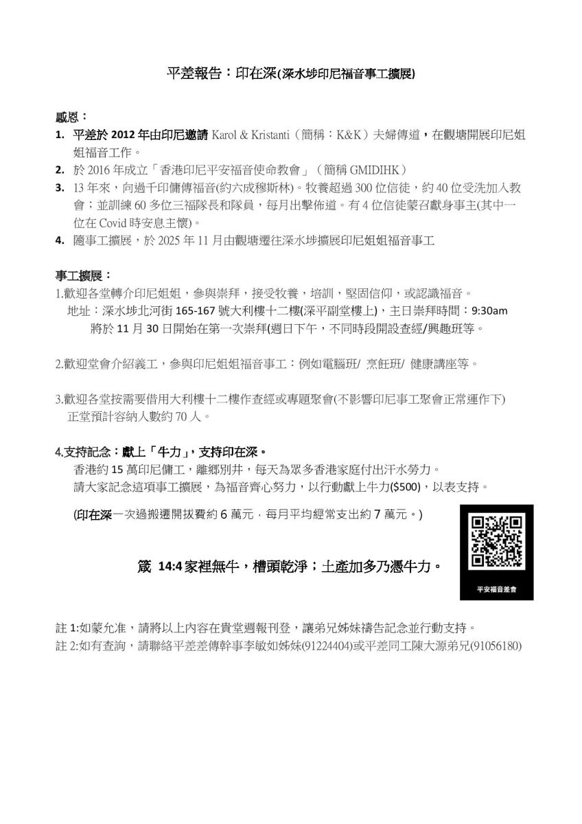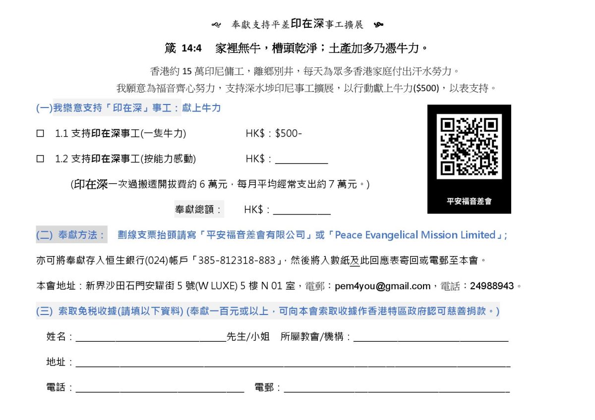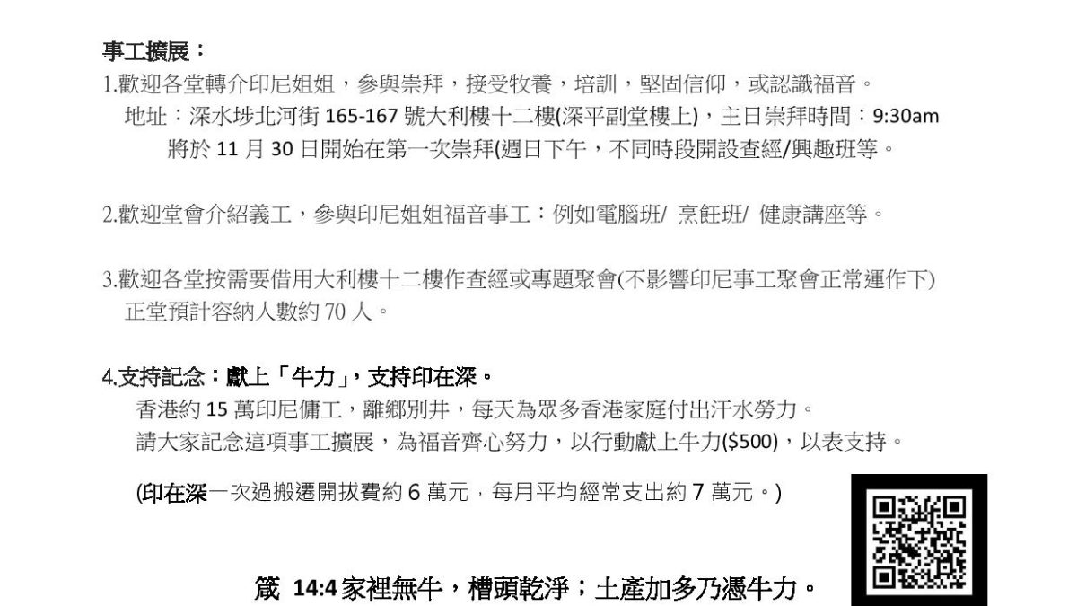 香港約15萬印尼傭工,離鄉別井,每天為眾多香港家庭付出汗水勞力。請支持平差深水埗印尼福音事工擴展,以行動獻上牛力($500)。