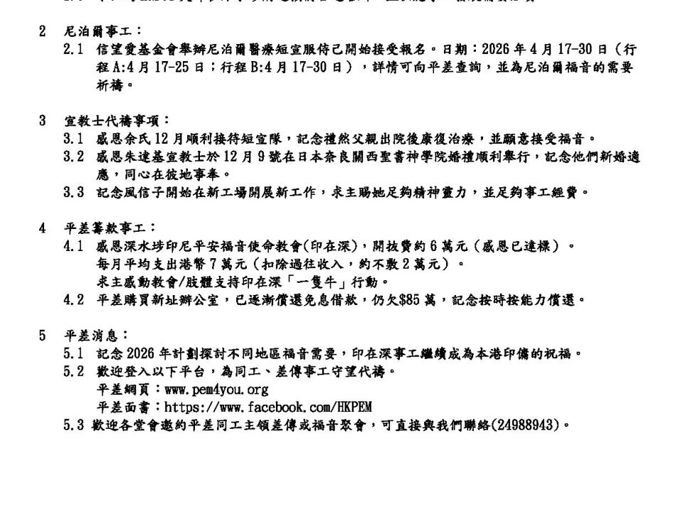 12 1 月, 2026 Related posts7 1 月, 2026平差2026年1月代禱消息Read more15 12 月, 2025平差2025年12月Read more3 12 月, 2025同哭Read more